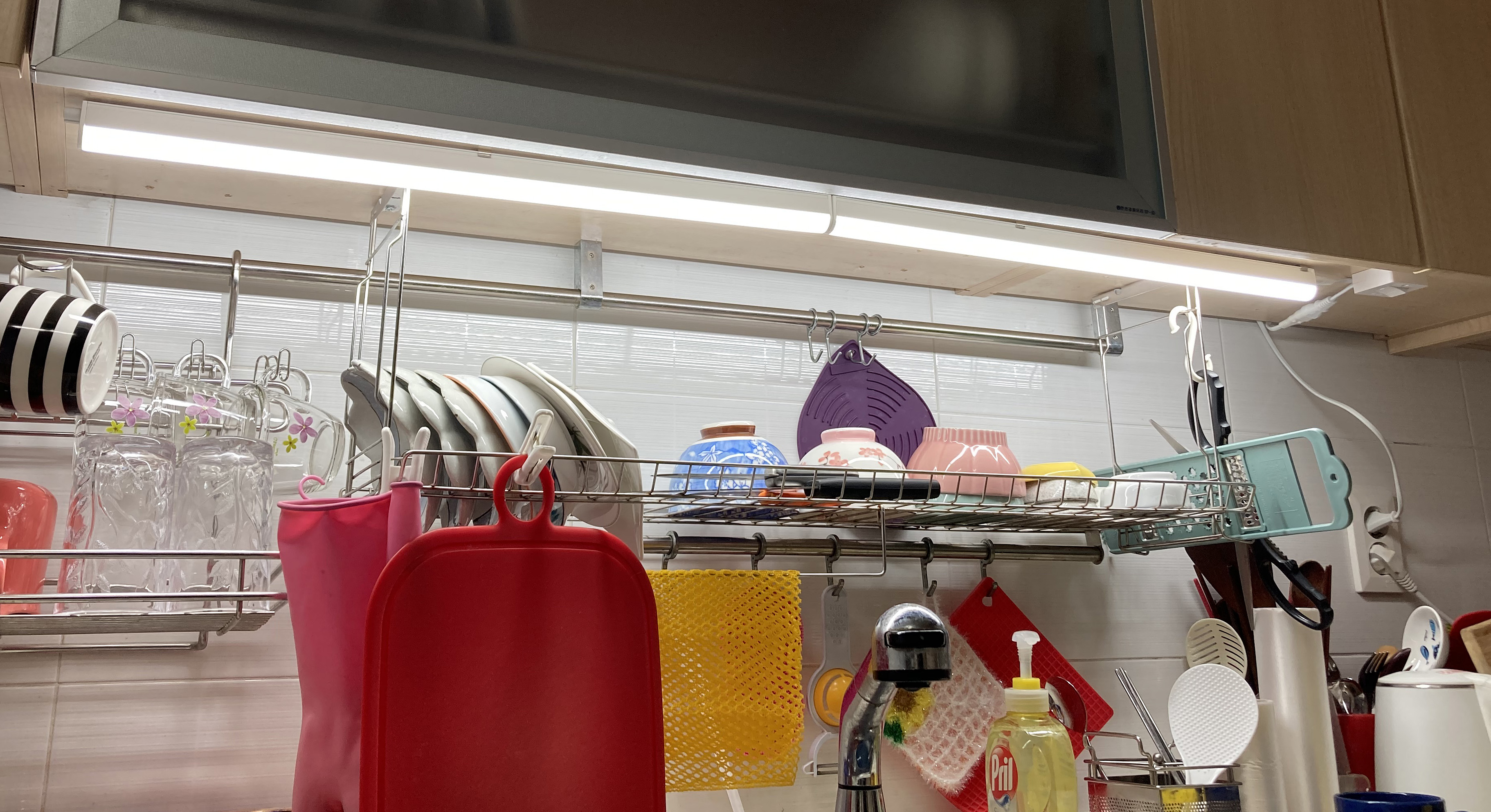 크게 불편함은 없었지만 눈이 부실 수 있어서 싱크대 선반을 분리하고 뒤에 다시 설치했습니다.